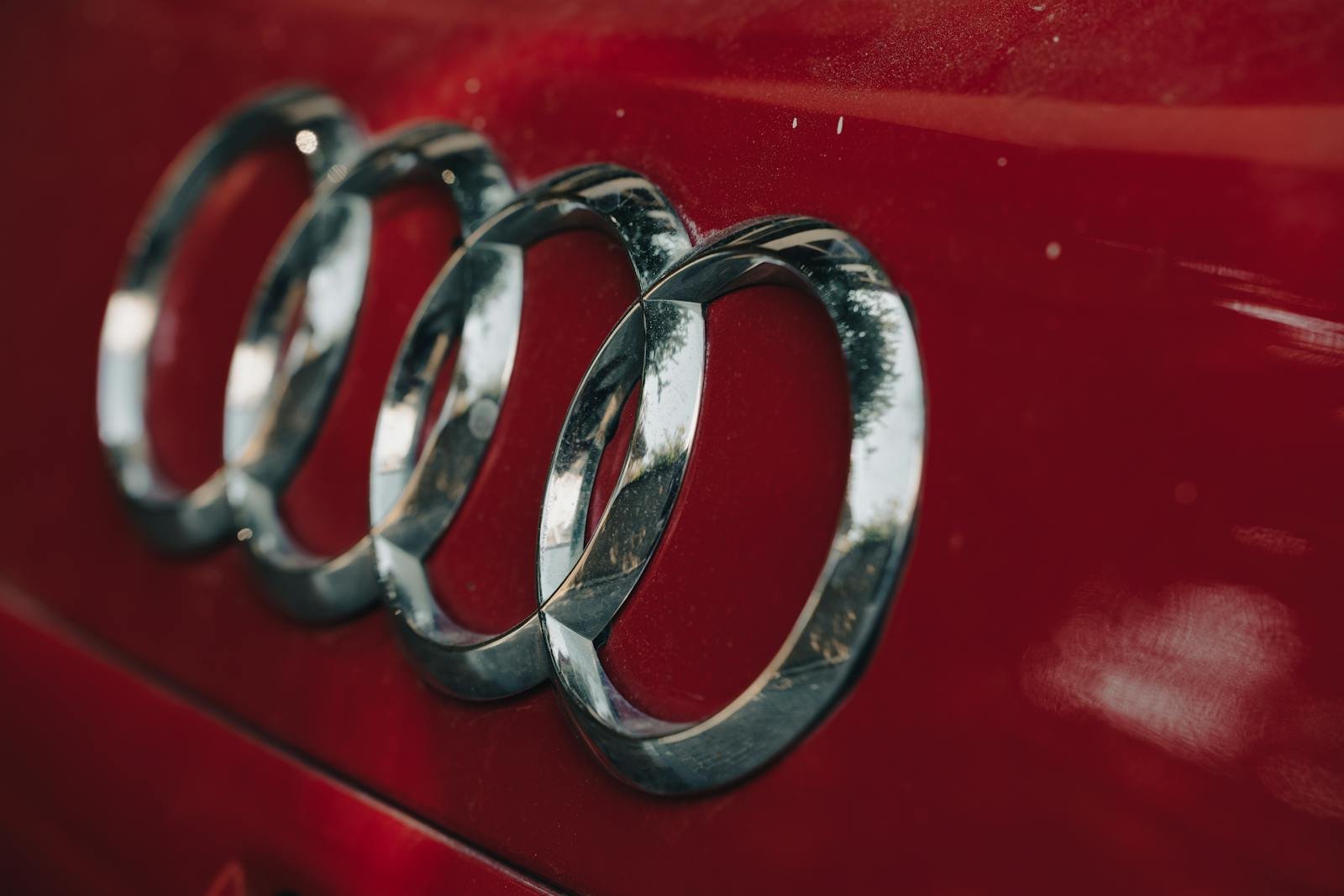 Close-up view of a chrome car emblem on a sleek red vehicle exterior.
